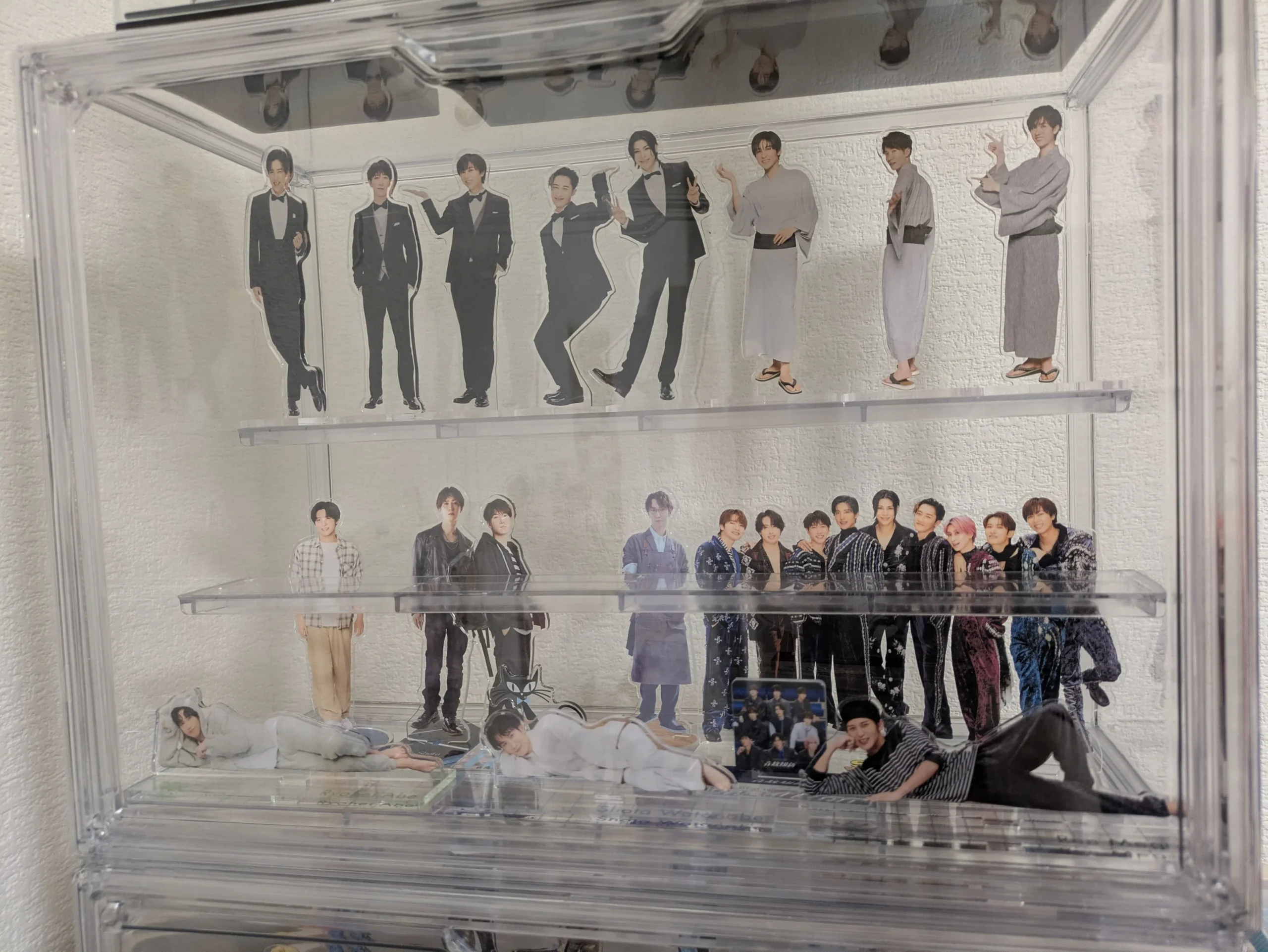 100均のアクリル台座などを利用して奥のグッズを高く配置すると、全員の顔が重ならず主役として輝きます。